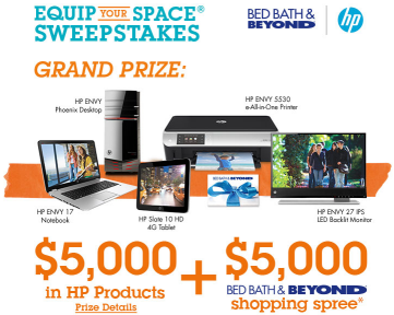 PRIZES – Sweepstakes Prizes: ONE (1) GRAND PRIZE: One (1) Grand Prize package. Package contains one (1) HP ENVY Phoenix Desktop, one (1) HP ENVY 27 IPS LED Backlit Monitor, one (1) HP 2 Yr Next Day Exchange Service for Consumer Monitors, one (1) HP ENVY 17 Notebook, one (1) HP Slate 10 HD 4G Tablet, one (1) HP Slate 10 Tablet Stand Case, one (1) HP ENVY 5530 e-All-in-One Printer, three (3) HP 61XL Black Ink Cartridge, three (3) HP 61XL Tricolor Ink Cartridge, one (1) HP 3 Yr Care Pack for Printers, one (1) HP LaserJet Pro Printer, two (2) HP 2-Pack Black LaserJet Toner Cartridges, one (1) HP 3 Yr Care Pack for LaserJet Printers, two (2) 5 Ream packages of Paper, one (1) Platinum Financial Calculator, one (1) HP SmartFriend 6 Month plan, one (1) 2 Year Notebook Warranty with Accidental Damage Protection, one (1) Beats Solo 2 HD Headphones, one (1) HP Premier 3 Blue Backpack, one (1) HP Bluetooth Wireless Speaker, one (1) HP HD Webcam, one (1) HP Wireless Keyboard, one (1) HP 32GB USB Flash Drive, one (1) HP Black Wireless Mouse, one (1) HP USB 3 Port Replicator, one (1) HP USB External DVDRW Drive, and a $5,000 USD Bed Bath & Beyond ® Shopping Spree awarded in the form of Bed Bath & Beyond ® Gift Cards. Approximate Retail Value (“ARV”): $10,008 USD.