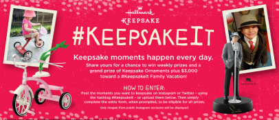 PRIZES – One (1) Grand Prize: $3,000 Visa Gift Card intended to be used toward a #KeepsakeIt family vacation and five (5) Keepsake Ornaments of the winner’s choice selected from the 2014 Hallmark Dream Book (subject to availability and Sponsor’s discretion). The Approximate Retail Value (“ARV”) of the Grand Prize is $3,100.