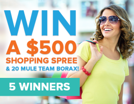 PRIZES – Grand Prize (5): Five Grand Prize Winners each receive $500 towards a shopping spree, and a box of 20 Mule Team Borax. Approximate Retail Value (ARV): $505.