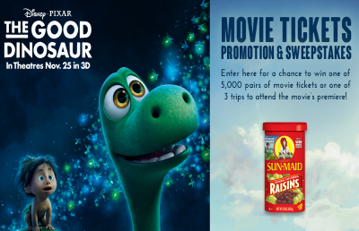 PRIZES – SWEEPSTAKES GRAND PRIZES (3): A trip for winner and one (1) guest to Disney Pixar’s The Good Dinosaur (the “Film”) movie premiere screening, scheduled to take place on or about November 17, 2015 in Los Angeles, CA. Trip includes round trip air transportation for winner and guest from a U.S. gateway airport nearest winner’s residence to movie premiere location; 2nights’ hotel accommodations (one (1) room, double occupancy), and two (2) tickets to the movie premiere screening. Approximate Retail Value “ARV” of each grand prize package: $2,500.00.Actual value of prize will vary depending city of departure and date of travel.