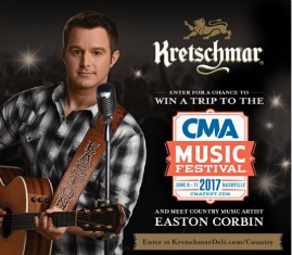 PRIZES – Sweepstakes Grand Prize: One (1) winner will receive a trip for two (2) to Nashville, TN. Trip package includes round trip, coach-class air transportation for two (2) from a major airport near winner’s home (determined by Sponsor in its sole discretion) to Nashville, TN; four (4) nights’ accommodations at a hotel determined by Sponsor in its sole discretion (single room, double occupancy); a $1,200 allowance for full-size rental car for length of stay, meals and incidentals; $2,500 that can be used for taxes; two (2) tickets to 2017 CMA Music Festival; a luncheon and meet and greet for winner and guest with Easton Corbin (location and date of meet and greet determined by Sponsor in its sole discretion); and travel agent services. If winner does not meet requirements for rental car, that portion of the prize will be forfeited in its entirety. Winner must travel on June 7th, 2017 and return on June 11th, or prize will be forfeited. Trip must be booked at least twenty-one (21) days prior to departure. Travel and accommodations are subject to availability and blackout dates. Travel must be round trip. Approximate Retail Value (“ARV”): $8,500.