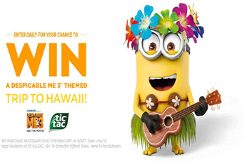 SWEEPSTAKES ENTRY PERIOD – Despicable Me 3™ – Tic Tac® 2017 Sweepstakes starts at 12:00:01 AM Eastern Time (“ET”) on May 4, 2017 and ends at 11:59:59 PM ET on August 3, 2017.