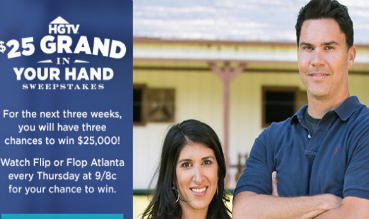 SWEEPSTAKES ENTRY PERIOD – The HGTV 25 Grand in Your Hand Sweepstakes begins at 9:00 p.m. Eastern Time (“ET”) on July 20, 2017 and ends at 8:59 p.m. ET on August 11, 2017.