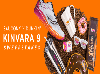 PRIZES – SIXTEEN (16) GRAND PRIZE(S): A $26.20 Dunkin’ gift card (terms and conditions of gift cards apply), one (1) Saucony X Dunkin’ Kinvara Shoe Approximate Retail Value (“ARV”): $110.00.