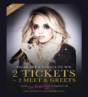 PRIZES – One (1) prize (“Prize”) will be awarded. Prize winner and one (1) age of majority guest will have the opportunity to attend the Carrie Underwood concert in Nashville, TN on 9/27/19 (“Event”). Total approximate retail value of prize (“ARV”): $2,700.00. If actual value of any prize is lower than the stated ARV when prize is procured and fulfilled, the difference will not be awarded. Prize consists of: round trip coach airfare for two (2) to/from a major commercial airport nearest to winner’s primary residence (as determined by Sponsors) to Nashville, TN (carrier used will be at the sponsors’ sole discretion and flights may include stopovers and/or connections); double occupancy hotel accommodations for two (2) nights (room and room tax only); two (2) passes to the Artist meet and greet; and two (2) tickets to the Event. All meals, ground transportation (other than as noted), taxes, gratuities, incidentals, upgrades, service charges or other expenses not specified herein are not included and are winner’s sole responsibility. Artist meet and greet is subject to Artist availability and will occur at a time and location determined by Sponsor in their sole discretion. In the event the winner resides within one hundred and fifty (150) miles of the Event venue, ground transportation to/from Nashville, TN will be provided in lieu of air transportation
