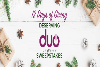 SWEEPSTAKES ENTRY PERIOD – The La-Z-Boy 12 Days of Giving 2017 Sweepstakes begins November 25, 2017 at 12:00 a.m. Eastern Time (“ET”) and ends December 6, 2017 at 11:59 p.m. ET.