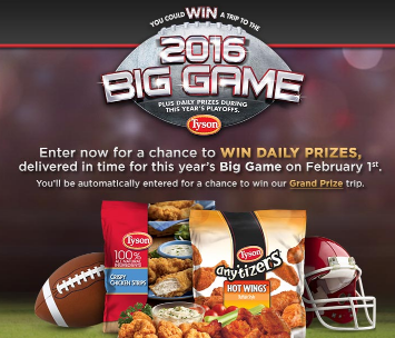 Tyson “Big Game” Sweepstakes – Win a trip to the 2016 Super Bowl & more!