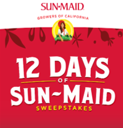 SWEEPSTAKES ENTRY PERIOD – The 12 Days of Sun-Maid (“Promotion”) begins at 12:00:00 AM Eastern Time (“ET”) on October 1, 2018 and ends at 11:59:59 PM ET on December 12, 2018.