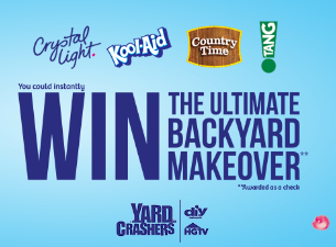 PRIZES – One (1) Grand Prize: A check for $50,000 (to go toward a backyard makeover); a Skype consultation with a licensed contractor from HGTV, a one (1) year supply of Powdered beverages (awarded in the form of 20 Crystal Light coupons each good for any 1 package of Crystal Light Powdered Drink Mix, 20 Kool-Aid coupons each good for any 1 canister of Kool-Aid Powdered Drink Mix, 20 Tang coupons each good for any 1 canister of Tang Powdered Drink Mix, 20 Country Time coupons each good for 1 canister of Country Time Powdered Drink Mix); and a beverage kit which includes a pitcher, a spoon, glassware, a serving tray, and a beverage dispenser. Approximate Retail Value (“ARV”): $50,614.